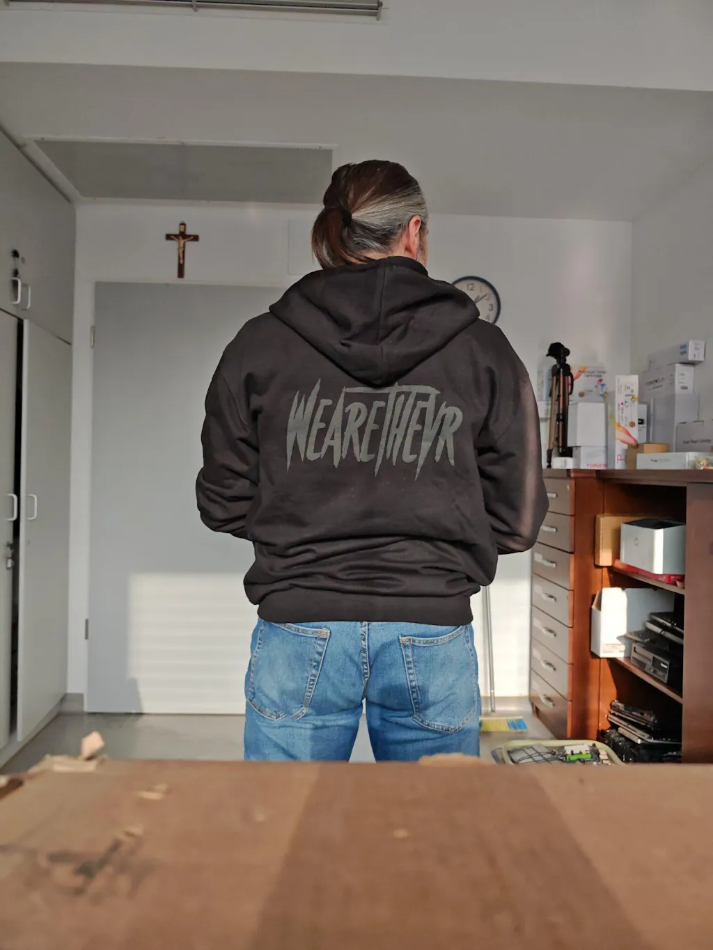 Illegálisnak kellene lennie ennek a pulcsinak, mert annyira pornós. Az alap ötlet az volt, hogy legyen egy cipzáros pulcsink egy WeAreTheVR logóval, de mielőtt azt mondtuk volna, hogy készen van, eszünkbe jutottak a fényvisszaverős ruhák és egy speciális fényvisszaverő anyaggal nyomattunk az elejére egy VR logót. Valahogy így készült a Stealth pulcsi... 😶🌫️