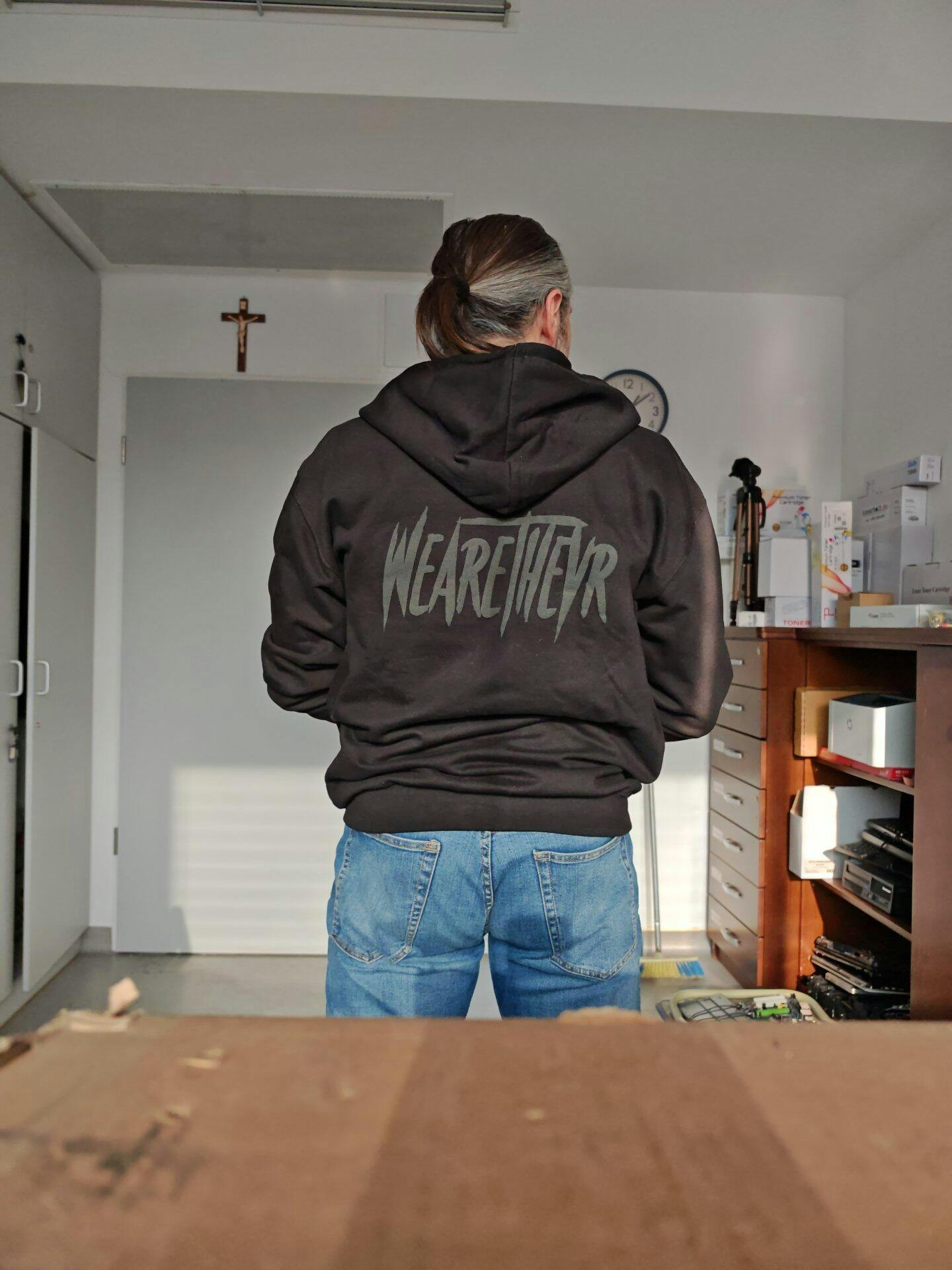 Illegálisnak kellene lennie ennek a pulcsinak, mert annyira pornós. Az alap ötlet az volt, hogy legyen egy cipzáros pulcsink egy WeAreTheVR logóval, de mielőtt azt mondtuk volna, hogy készen van, eszünkbe jutottak a fényvisszaverős ruhák és egy speciális fényvisszaverő anyaggal nyomattunk az elejére egy VR logót. Valahogy így készült a Stealth pulcsi... 😶🌫️